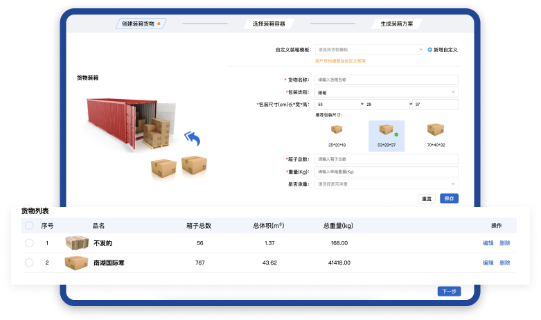 录入货物清单,可指定纸箱、木箱堆叠和承重等限制条件。